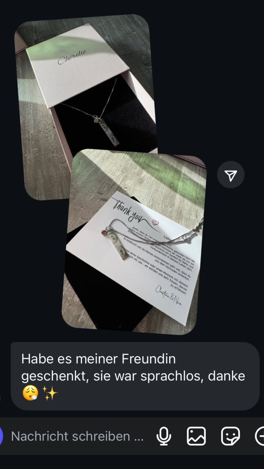 Die Kette ist so schön und fühlt sich auch qualitativ hochwertig an. Einziger Haken war die längere Lieferzeit trotz Expressversand. Kontakt zum Chérelie-Team war diesbezüglich aber sehr einfach und hilfreich, Kosten wurden direkt erstattet und dann war das Paket auch ein paar Tage später da. Würde mich nicht daran hindern wieder zu bestellen :)